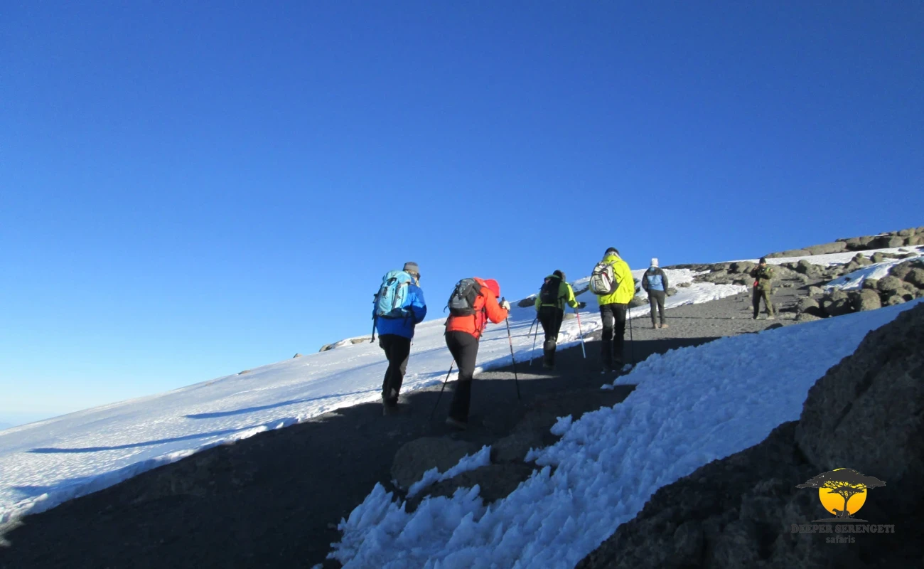 The steady ascent leads to Kibo Hut, located at the base of the Kibo crater wall. Upon arrival, you rest, hydrate, and enjoy an early dinner. A full briefing prepares you for the midnight summit attempt