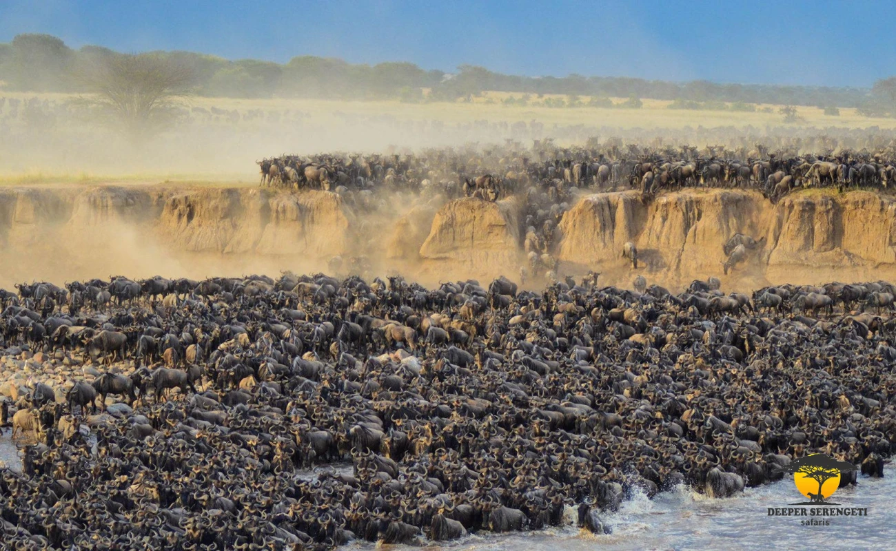 Thousands of wildebeest may gather at the riverbank, hesitating for hours before a single animal triggers the charge