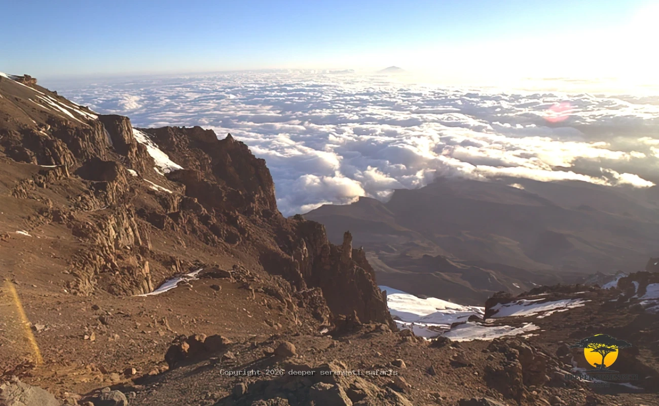 The climb to Stella Point (5,756m) is steep and demanding. As dawn breaks over the African plains, you continue along the crater rim toward Uhuru Peak. the highest point on the continent.