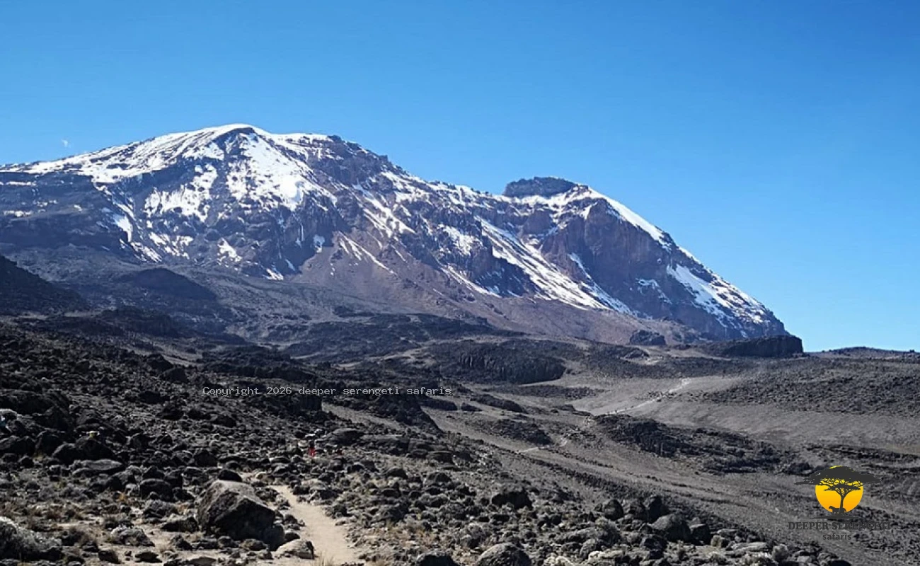 A steady climb brings you to Barafu Camp, your base for the summit attempt. The landscape is stark and windswept, with dramatic views of Kibo and Mawenzi peaks.