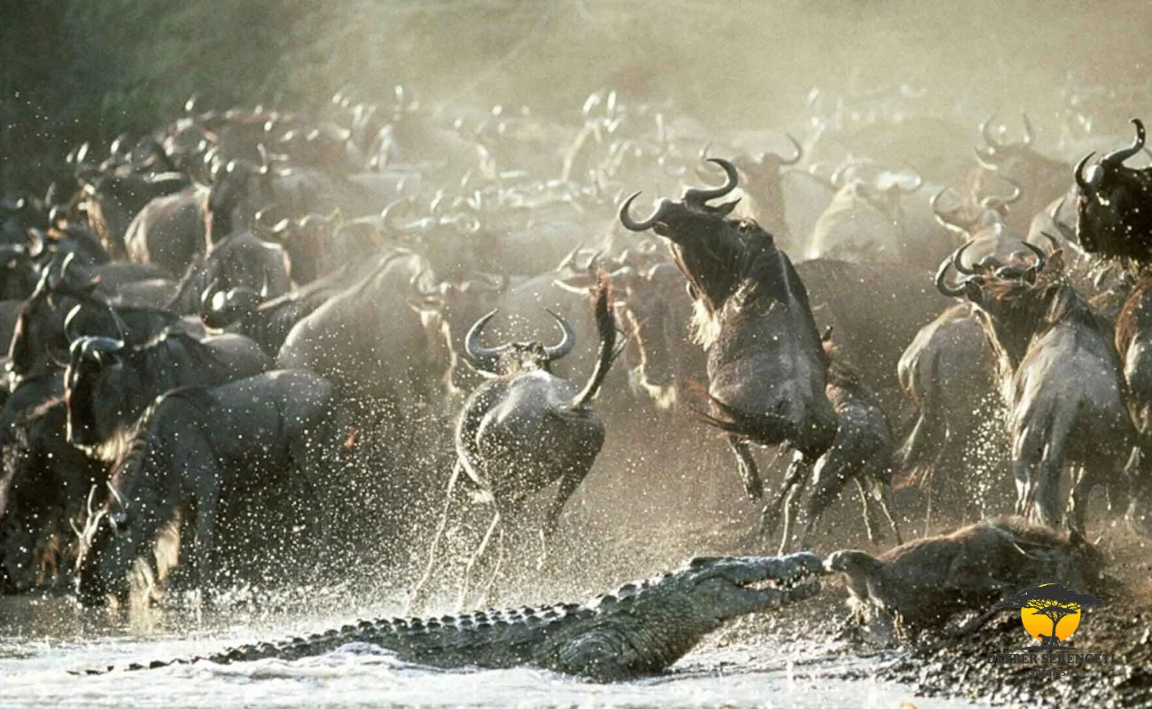 Thousands of wildebeest may gather at the riverbank before one animal triggers the crossing, resulting in explosive movement, splashing water, and dramatic predator interaction